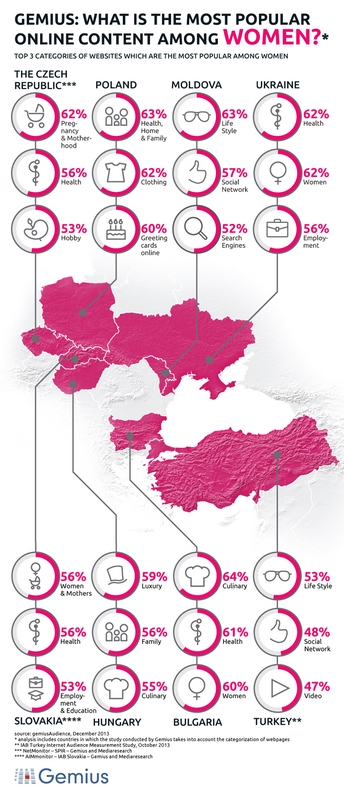 Největší podíl uživatelek zaznamenala kategorie Těhotenství a rodičovství (62 %), nejvyšší podíl mužských uživatelů byl pak zaznamenán u kategorie Auto-moto (67 %). Společnost Gemius zkoumala, do jaké míry ovlivňuje pohlaví návštěvnost jednotlivých kategorií webových stránek. Z analýzy provedené na osmi trzích (v ČR, na Slovensku, v Maďarsku, Polsku, Turecku, Bulharsku, Moldavsku a na Ukrajině) vyplývá, že ženy navštěvují především webové stránky zaměřené na mateřství, zdraví, lifestyle, vaření a luxusní zboží. Například kategorie Zdraví patří mezi tři nejnavštěvovanější kategorie mezi ženami v ČR, na Slovensku, Ukrajině, v Polsku, Bulharsku a Moldavsku, kategorie Těhotenství a rodičovství v ČR a na Slovensku a kategorie Vaření v Maďarsku a Bulharsku.