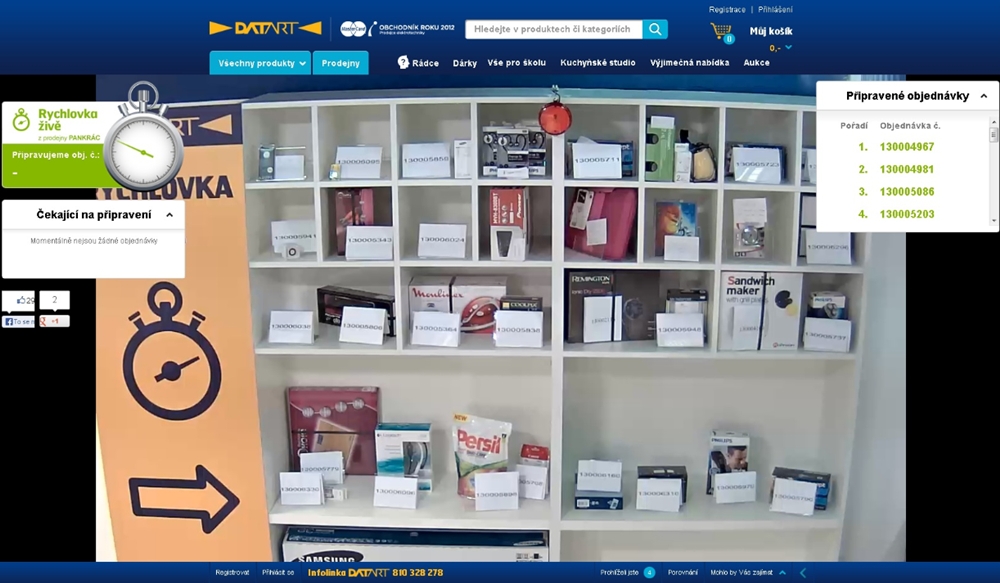 Novinka „Rychlovka živě“ je na české poměry unikátní. Jde s trendy a představuje „reality show“ v prodeji přes internet. Jak přesně tato novinka funguje? Když navštívíte eShop Datart.cz a vyberete si zboží, které je na prodejně Pankrác, košík eShopu vás automaticky přesměruje na stránku, kde vidíte příslušný regál s objednaným produktem. V reálném čase pak máte možnost vidět, zda máte zásilku připravenou.