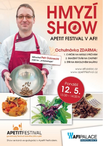 K ochutnání zde budou cvrčci na másle, smažený šváb na chutney nebo štír na rukolovém salátku. Akce v AFI Paláci je pořádána ve spolupráci s APETIT Festivalem, který proběhne ve druhé polovině června v Pardubicích.