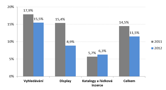 Pokud jde o jednotlivé kategorie internetové reklamy, největší nárůst vykázala reklama ve vyhledávání (o 15,5 % na 11,9 mld. euro). Celoplošná reklama vzrostla loni o 9 % na 7,9 mld. euro. Výrazně se na tom podílel nárůst investic do reklamy pro mobilní zařízení a do videoformátů. Výdaje do placených inzerátů a katalogů stouply o 6 % na 4,5 mld. euro, což autoři připisují přesunu investic do tohoto druhu reklamy z tisku na internet.