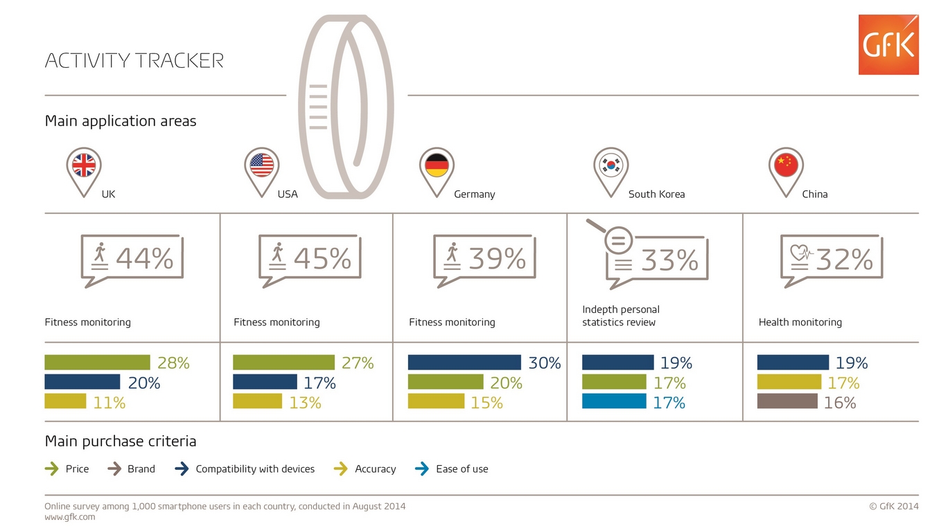 Ve zkoumaných zemích se rovněž lišily názory na to, jaká jsou nejdůležitější kritéria, podle nichž se lidé rozhodují, zda zařízení koupit. V Německu 30 procent respondentů prohlašuje, že nejdůležitějším kritériem je kompatibilita mezi chytrým telefonem a jinými zařízeními. Pro 20 procent Němců je klíčovým faktorem cena, zatímco přesnost považuje za nejvyšší kritérium 15 procent respondentů. V Číně je kompatibilita rovněž téměř nejčastěji uváděným faktorem (19 procent) a za ní následuje přesnost zařízení (17 procent). Pro 16 procent čínských spotřebitelů je však rozhodujícím faktorem při nákupu zařízení také značka. Ve Spojeném království se spotřebitelé u monitorů aktivit zaměřují především na jejich cenu – 28 procent respondentů uvádí, že při zvažování koupě tohoto zařízení právě cena hraje nejdůležitější roli. Na druhém a třetím místě je v Británii kompatibilita s 20 procenty a přesnost s 11 procenty. Podobný obrázek lze vidět i ve Spojených státech, kde cena zaujímá první místo s 27 procenty, po ní následuje kompatibilita se 17 procenty a přesnost s 13 procenty. Avšak v Jižní Koreji je za nejdůležitější faktor považována kompatibilita (19 procent), zatímco cena a uživatelská přívětivost se dělí o druhé místo (obě 17 procent).
