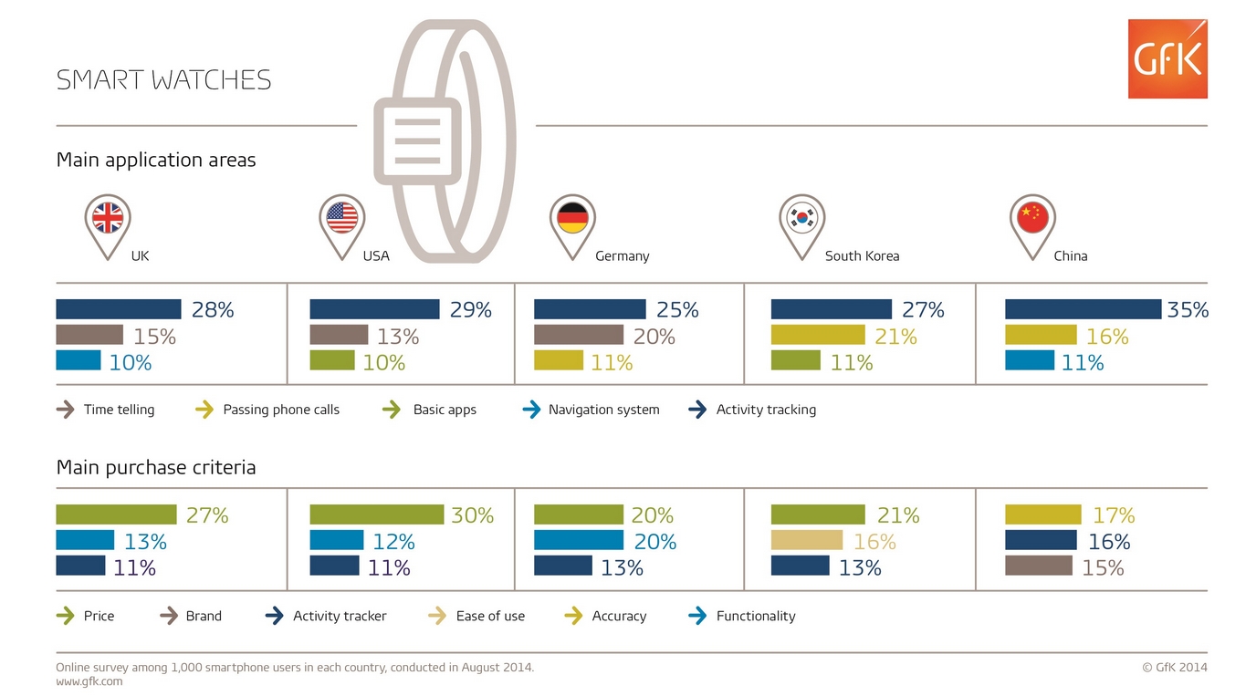 Ve všech zkoumaných zemích kromě Číny je cena chytrých hodinek při nákupu nejdůležitějším kritériem. Využití různých funkcí se ve většině zemí uvádí na druhém místě a možnost monitorovat a zobrazovat údaje o aktivitě a zdravotním stavu na místě třetím. Naopak čínští spotřebitelé přikládají největší význam přesnosti chytrých hodinek, po níž následuje zaznamenávání aktivity a značka. Zjištění tohoto výzkumu jasně prokazují, že největší zájem o značkové produkty je v Číně.