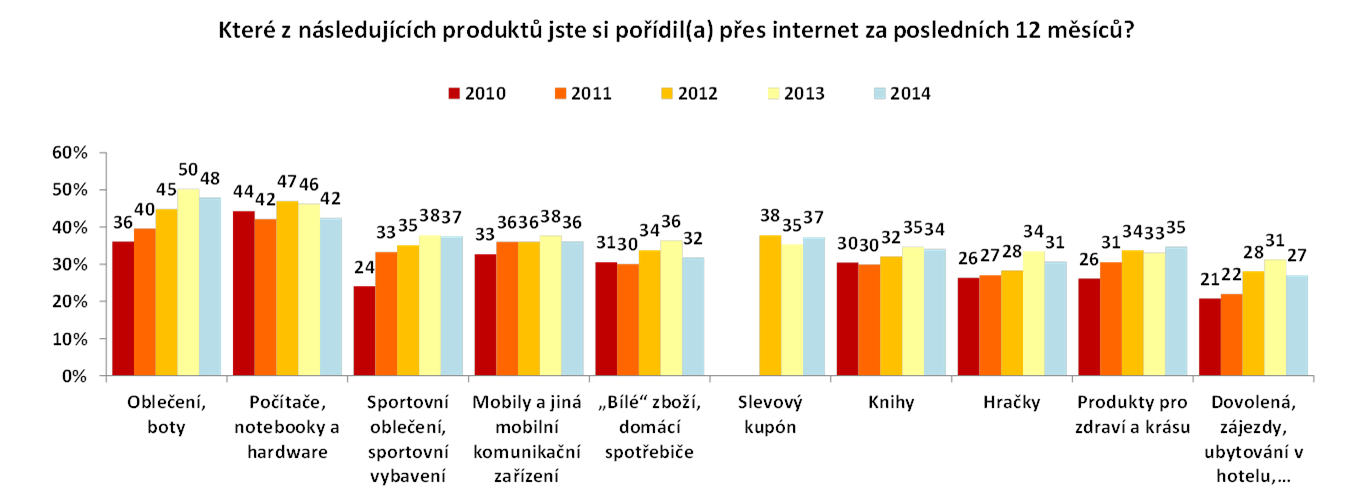 Celkem 48% respondentů potvrdilo, že si v uplynulých dvanácti měsících zakoupili pomocí internetu oblečení či boty. Jedná se tak o prakticky stejnou skupinu jako v roce 2013, vloni si tento druh zboží objednalo po síti 50% e-zákazníků. Počítač, notebook či hardware si koupilo 42%, sportovní vybavení 37% a mobily a obdobná zaříení 36% spotřebitelů. Mezi službami pak s 25% dominuje doprava – jízdenky na vlaky a autobusy. Obou kategorií se pak dotýkají slevové kupony, které si koupilo 37% Čechů.