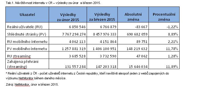 V březnu rostly téměř všechny ukazatele návštěvnosti internetu. Jednalo se především o zobrazení stránek, což mohl ovlivnit také vyšší počet dní v měsíci oproti únoru. Denně navštívilo weby měřené výzkumem téměř 3,5 milionu uživatelů a délka jedné návštěvy dosáhla téměř 8 minut. Měsíčně strávili uživatelé na těchto stránkách více než 26 hodin, denně pak více než hodinu a půl.