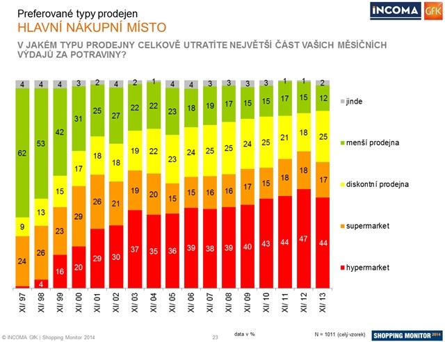 Podle výsledků aktuální studie SHOPPING MONITOR nakupovali Češi v posledních 6 měsících nejraději v hypermarketech; 44 % českých domácností uvádí, že v nich utratilo největší část svých výdajů za potraviny a drogerii. Jejich podíl nicméně meziročně mírně poklesl. Naopak diskontní prodejny zaznamenaly v meziročním srovnání výrazný nárůst, jako své hlavní nákupní místo je uvádí ¼ domácností. Obliba supermarketů zůstává stabilní (17% preference), naopak menší tradiční prodejny uvádí jako své hlavní nákupní místo potravin nejméně domácností (jen 12 %) za celé sledované období (od roku 1997).