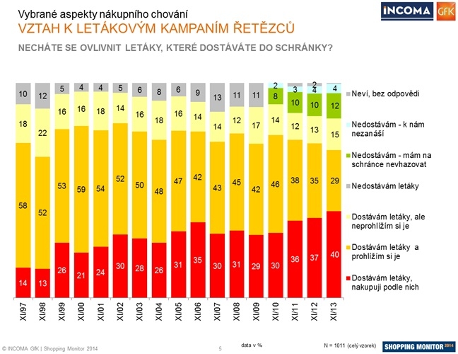 Na vypjatě konkurenčním trhu jsou stále hlavním nástrojem pro přilákání zákazníků promoce. Úroveň distribuce letáků maloobchodních řetězců v Česku je vysoká; 84 % oslovených domácností dostává letáky do svých poštovních schránek. Nejčastěji si respondenti vybavují letáky společností Kaufland, Lidl, Penny Market a Tesco. Čtvrtý rok za sebou se ve výzkumu SHOPPING MONITOR zvýšil podíl domácností, které podle letáků nakupují: v posledních 6 měsících podle nich nakupovalo 40 % českých domácností a to je zatím největší podíl respondentů za celé sledované období (od roku 1997). Zároveň se ale v posledních letech také postupně zvyšuje podíl domácností, které mají na schránce žádost o nevhazování letáků (nyní je to už 12 % domácností).