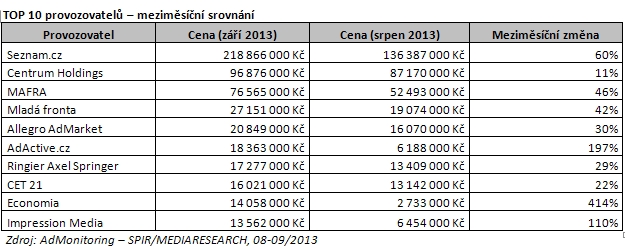 Největším zadavatelem reklamy se znovu stal internetový obchodník Internet Mall, který v září využil reklamní prostor na internetu v hodnotě 30 milionů korun. Na druhém místě skončila společnost Student Agency s inzercí v hodnotě 18,2 milionů korun a třetí byl obchodník Lidl Česká republika, který umístil reklamu za 11,8 milionů korun.