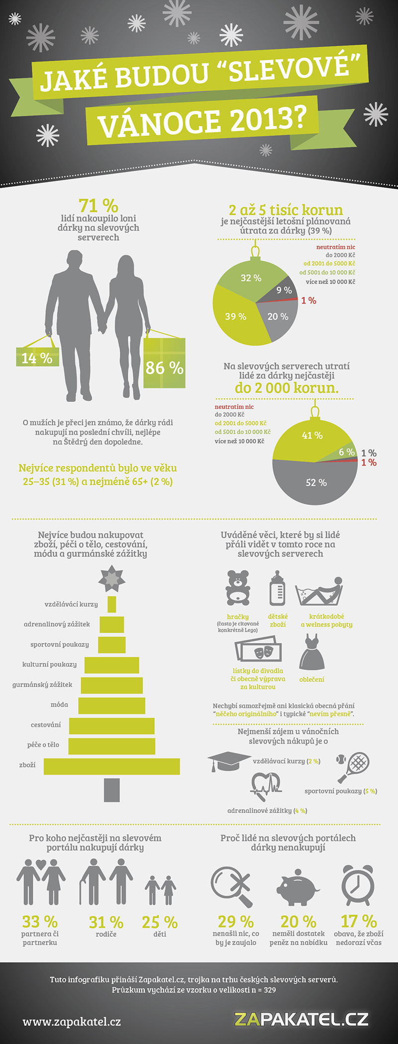Vyplývá to ze statistiky a průzkumů třetího největšího českého slevového portálu Zapakatel.cz. Ten zároveň odhaduje, že zákazníci na jeho stránkách letos utratí kolem 94 milionů korun.
