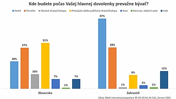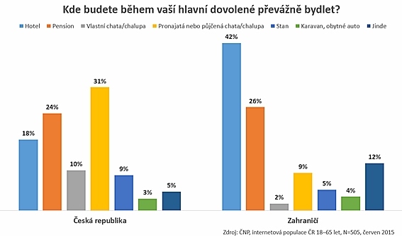 Výzkum rovněž zjišťoval, kde respondenti plánují během své dovolené bydlet. V této otázce se u dotázaných z řad internetové populace z obou panelů ukázaly stejné preference: jak Češi, tak Slováci dávají v zahraničí přednost hotelům (42 %, respektive 47 %) a na druhém místě penzionům (26%, respektive 28 %). U Čechů pak platí, že více než Slováci přespávají na dovolené ve stanech (5 % vs. 2 %) nebo v karavanech či obytných autech (4 % vs. 1 %).