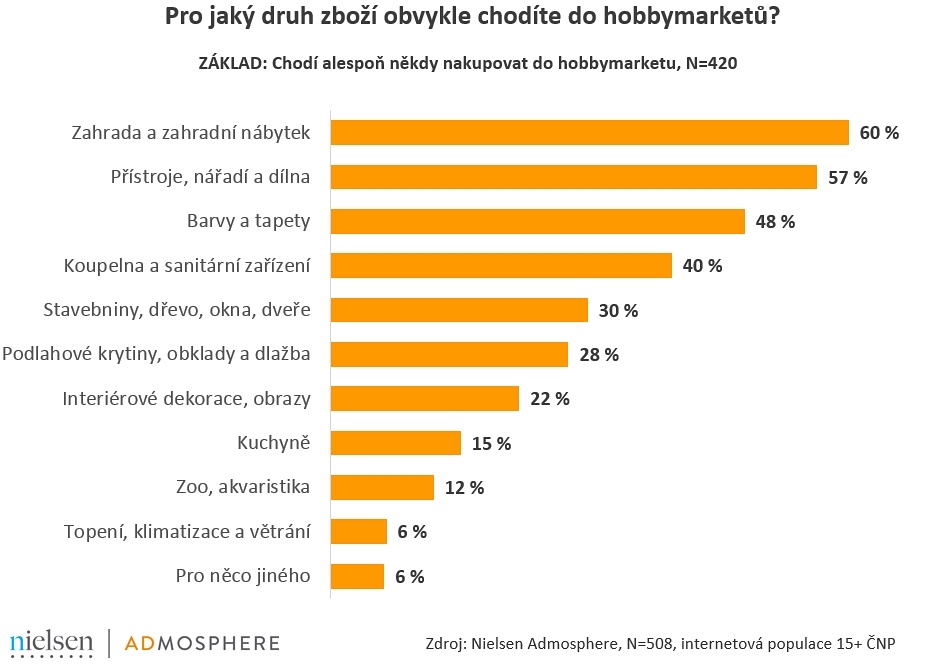 Mezi nejčastější zboží, které si lidé v hobbymarketech pořizují, patří pomůcky na zahradu a zahradní nábytek a dále přístroje, nářadí a pomůcky do dílen – obě tyto skupiny produktů byly zastoupeny ve zhruba 60 % odpovědí. Téměř polovina lidí pak obvykle využívá hobbymarkety k nákupu barev a tapet a dvě pětiny si tam pořizují produkty do koupelny a sanitární zařízení.
