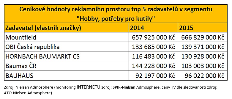 Při pohledu do monitoringu inzerce Ad Intel společnosti Nielsen Admosphere je patrné, že reklamní prostor v nejvyšší ceníkové hodnotě využil v posledních dvou letech v segmentu „Hobby, potřeby pro kutily“ Mountfield – v roce 2015 mu navíc patřil prostor v hodnotě o necelých 9 milionů vyšší než v roce 2014, a dosáhl tak ceny 667 milionů korun. Tím také téměř pětinásobně převýšil hobbymarket Obi, kterému patří druhé místo – ten loni inzeroval na ploše v hodnotě 139 milionů korun. Třetí místo obsadil Hornbach s reklamou v hodnotě 131 milionů korun, na čtvrtém pak skončil Baumax, který na rozdíl od ostatních hobbymarketů v žebříčku využil v loňském roce inzertní prostor v hodnotě o 41 milionů korun nižší než v roce předcházejícím, což představovalo 103 milionů korun. Na pátém místě skončil Bauhaus s reklamním prostorem v hodnotě 96 milionů korun.
