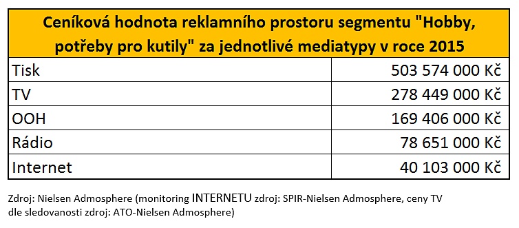 Primárním mediatypem sektoru „Hobby, potřeby pro kutily“ byl v loňském roce tisk, kde byla vystavena inzerce v celkové ceníkové hodnotě 504 milionů korun. Na druhém místě byla televize s reklamou v hodnotě 279 milionů korun, na třetím OOH (169 milionů korun), na čtvrtém pak rádio (79 milionů korun) a na pátém internet (40 milionů korun).